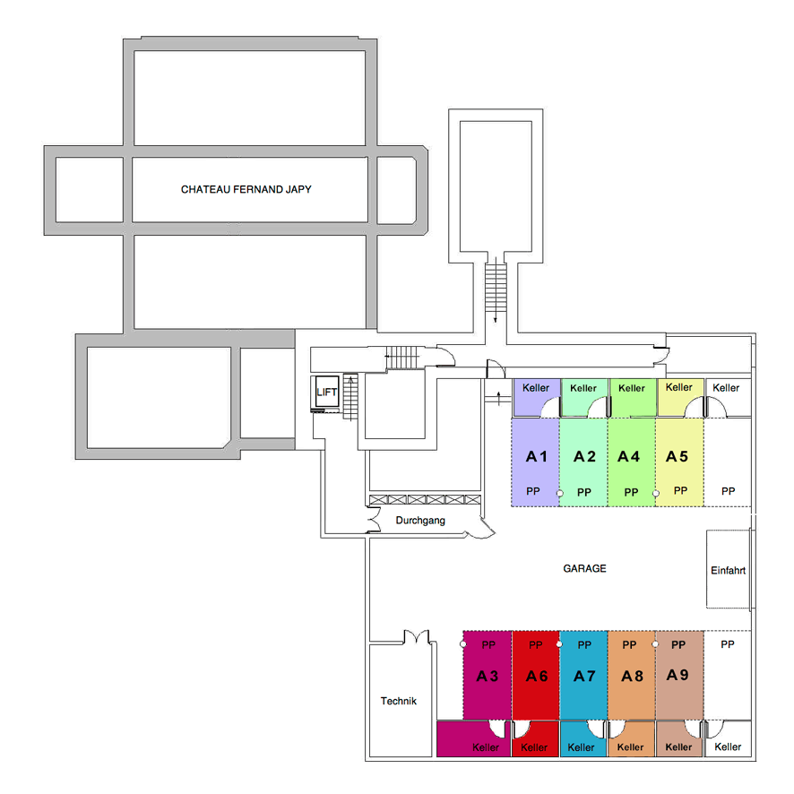 Für jede Wohnung gibt es einen Parkplatz in der Tiefgarage, sowie einen privaten Kellerraum direkt hinter dem Parkplatz, praktisch um Wein, Velos oder Ihre Sportausrüstung zu lagern. Ab der Tiefgarage fährt der Lift in alle Etagen.