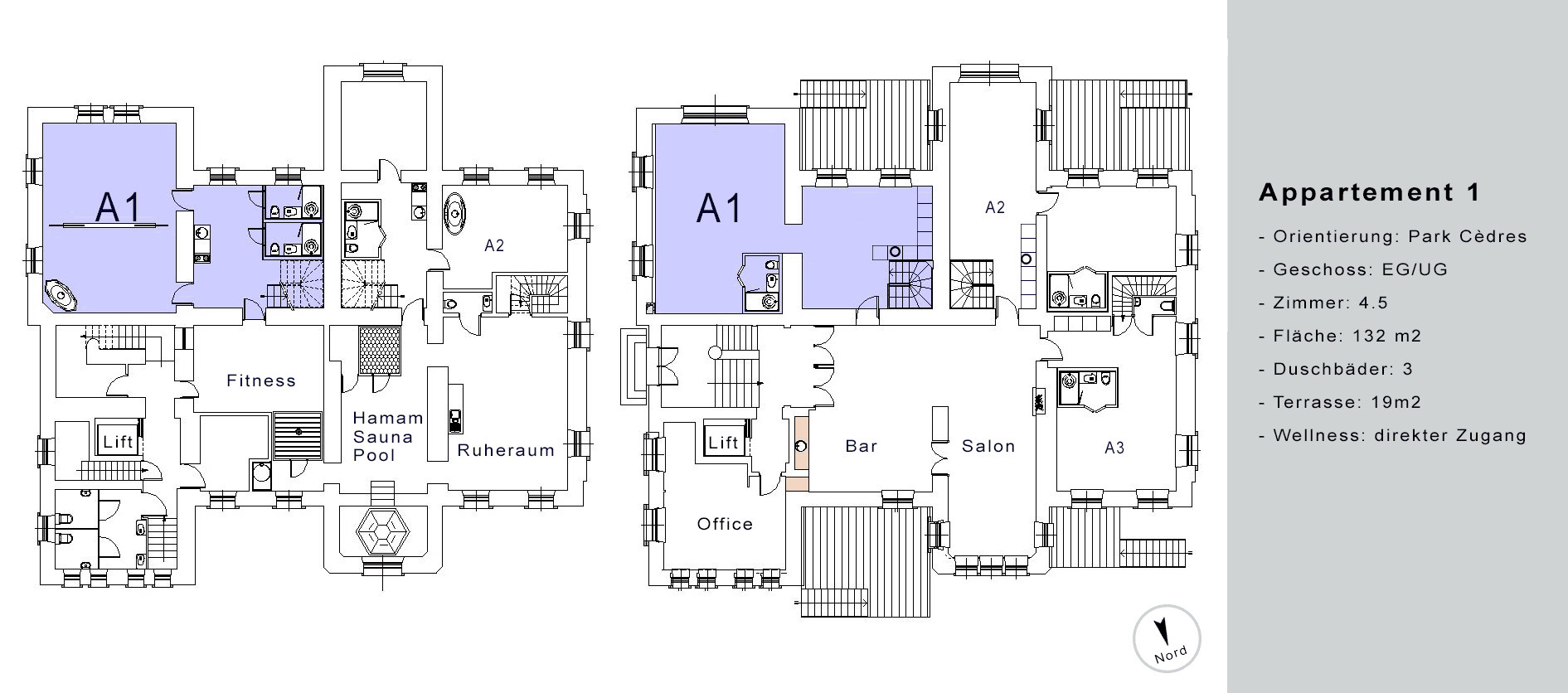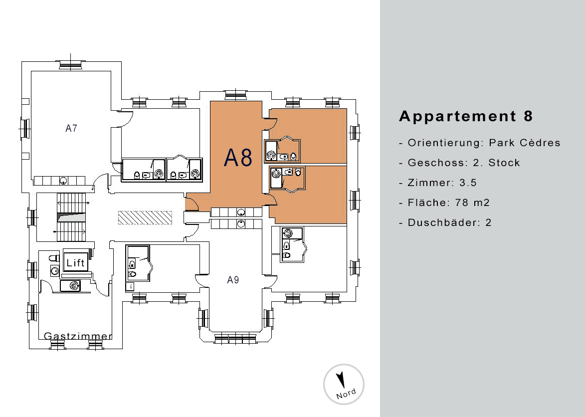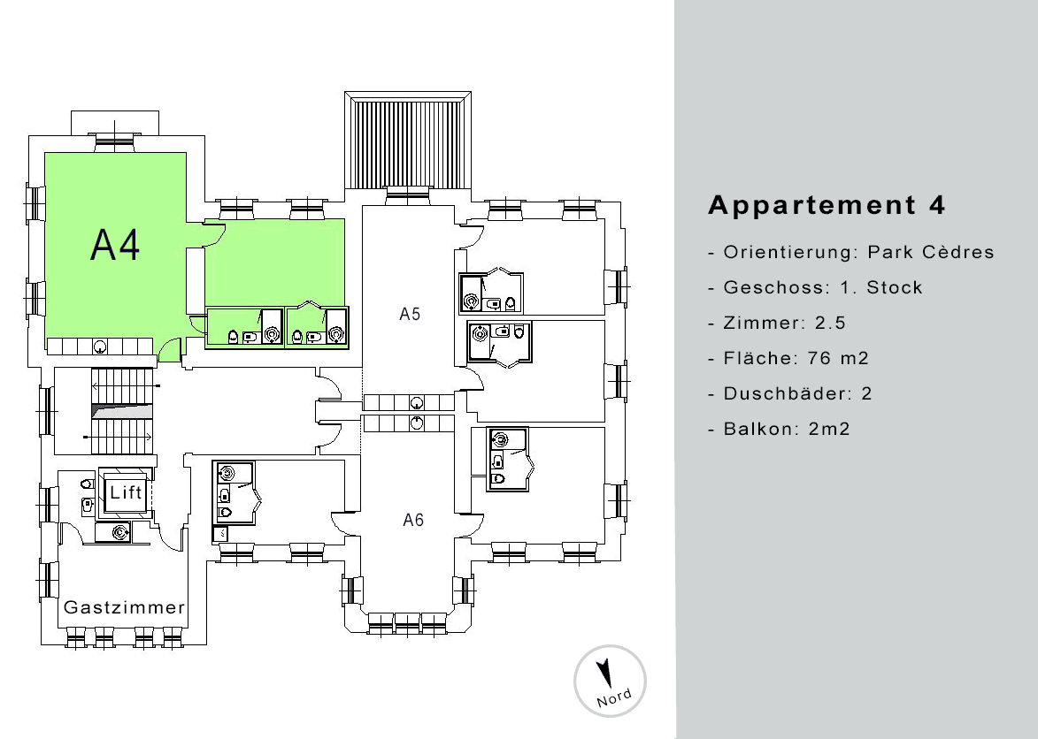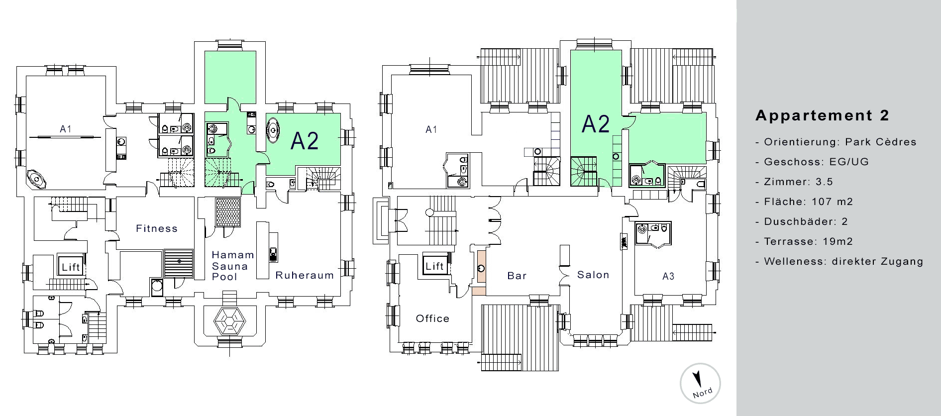 Die Erdgeschoss-Wohnungen haben zusätzlich eine grosse Terrasse mit abschliessbarem Ausgang Richtung Park sowie einen direkten Zugang zum Wellness-Bereich im Untergeschoss. Von den anderen Wohnungen aus erreichen Sie den SPA bequem via Lift.
